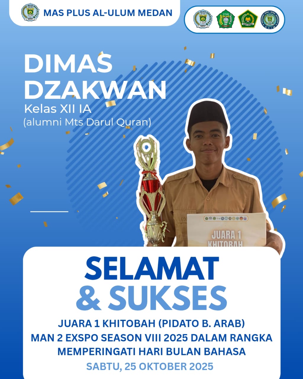 MMedan, 25 Oktober 2025 — Siswa MAS Plus Al Ulum Medan, Dimas Dzakwan, berhasil meraih Juara 1 Lomba Khitobah (Pidato Bahasa Arab) pada ajang MAN 2 Expo Season VIII Tahun 2025, yang digelar pada Sabtu, 25 Oktober 2025 dalam rangka memperingati Bulan Bahasa. Kegiatan tahunan yang diselenggarakan oleh MAN 2 Model Medan ini diikuti oleh […]